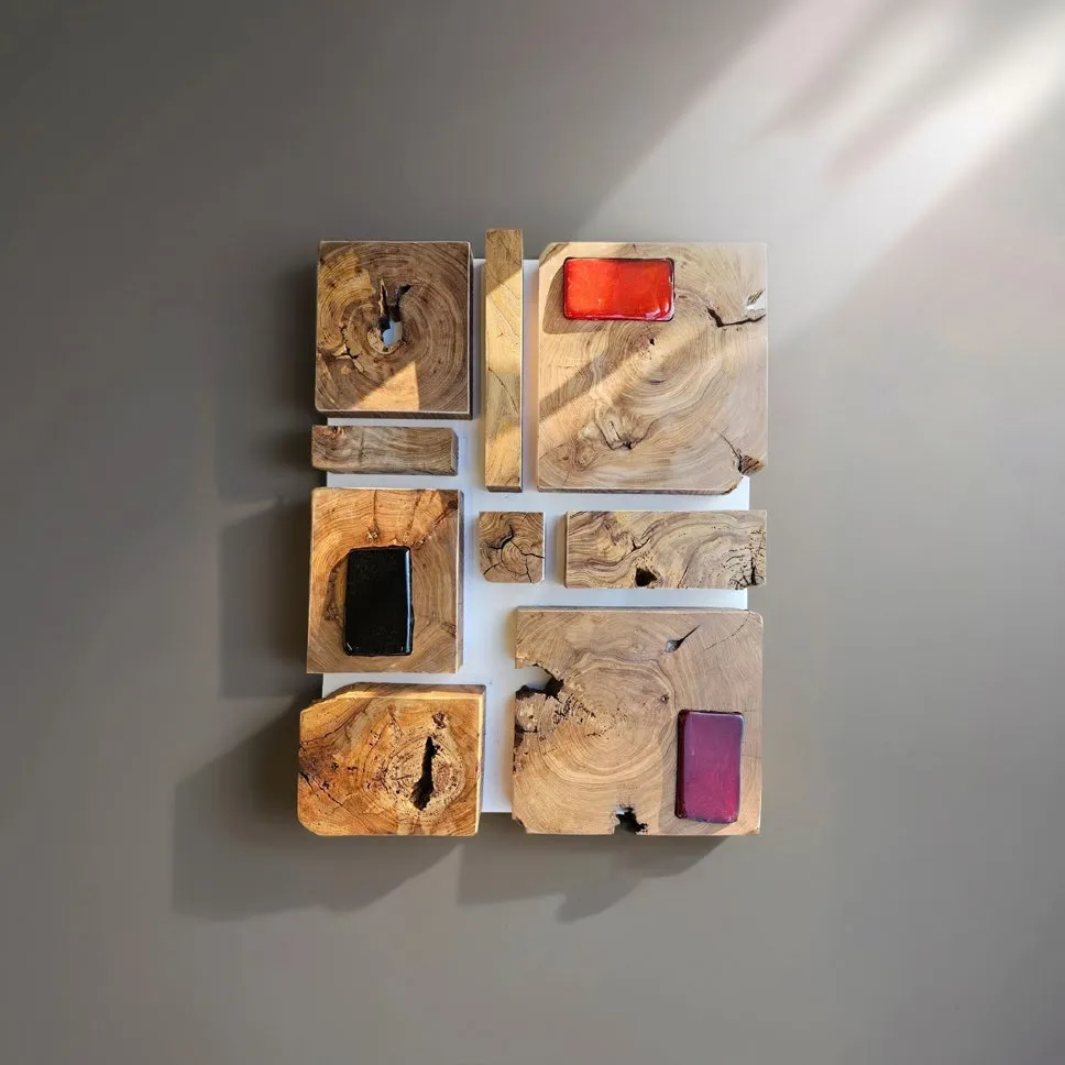 Органические формы, кольца спилов, текстура трещин и цветные вставки из декоративного стекла создают уникальный ритм — словно современный орнамент.
