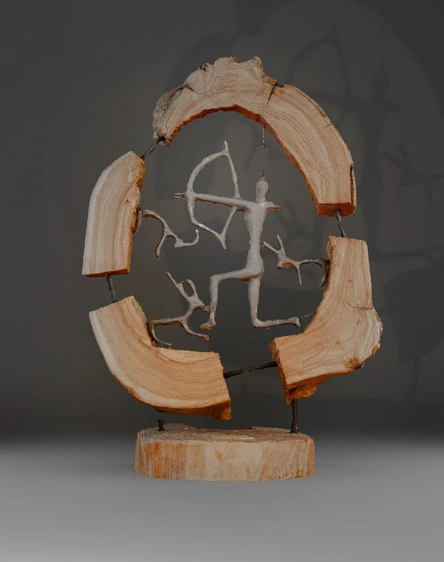 Скульптура «На охоте» переносит нас в мир древних ритуалов и обрядов, где охота была не просто способом добычи пищи, но сакральным действом. Центральный элемент — петроглиф лучницы, выпускающей стрелу — иллюстрирует древний способ визуализации мечты. Древние люди верили, что изображение успешной охоты привлечёт удачу и поможет приблизить желаемую реальность.