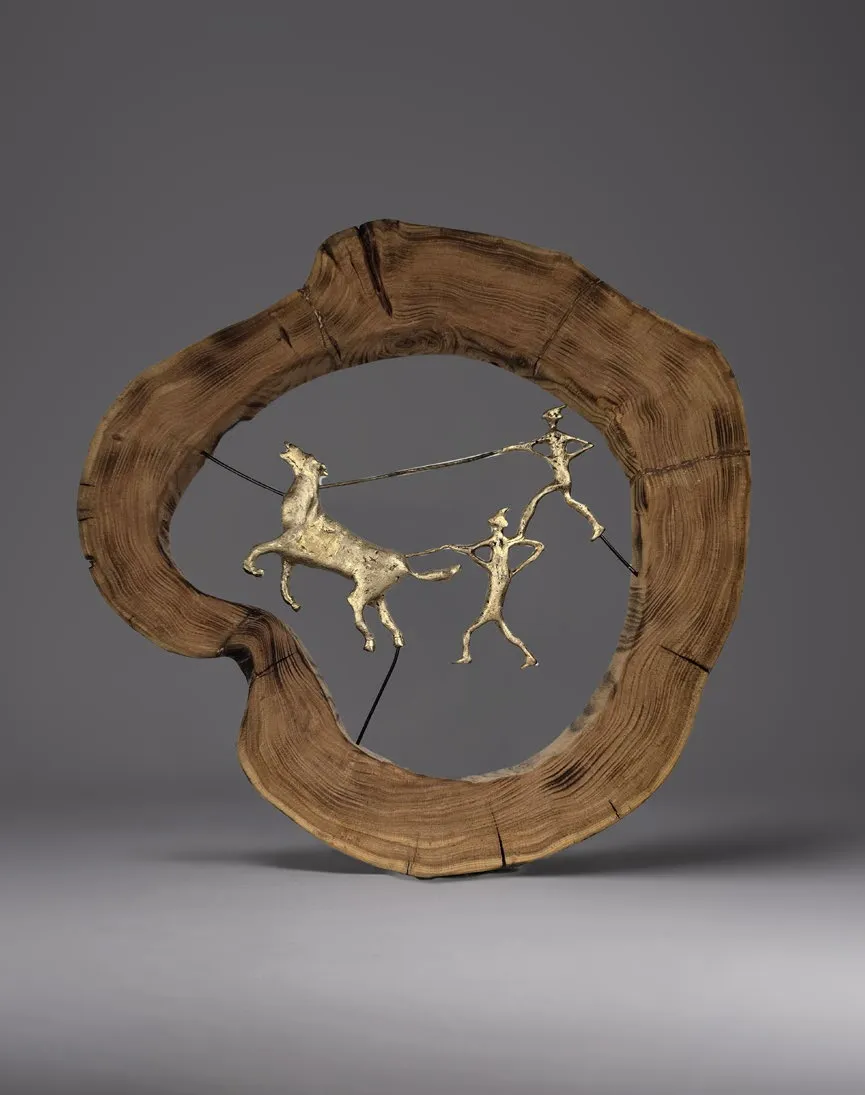 Лёгкие силуэты охотников и дикого коня отсылают к первым образам на скалах, к ритму древнего степного быта, где человек и природа ещё были почти равны.