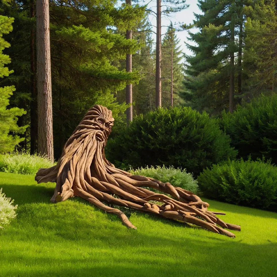 Берендей — Дух Леса, добрый страж природы, воплощённый в дереве. Его длинные, словно живые корни и грива струятся по склону, становясь частью земли, трав, ветра.